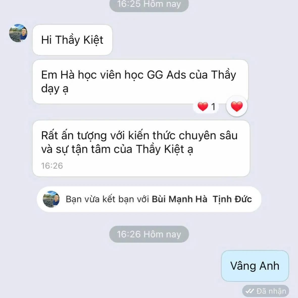 Mình là newbie đang tập tành học ads, lượn lờ sao tìm được khoá GG ads này. Anh hướng dẫn siêu chi tiết dễ hiểu, nội dung tinh gọn có ví dụ. 10/10