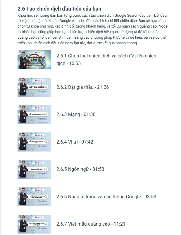 Vì vậy, nếu bạn đang tìm kiếm một cách tốt hơn để không lãng phí và bán hàng một cách bùng nổ bền vững và có lãi thì bạn thật may mắn. Khóa học quảng cáo Google Search AI là chương trình từng bước chỉ cho bạn chính xác cách thiết lập và tối ưu hóa Chiến dịch quảng cáo Google của bạn để thành công, bất kể mức độ kinh nghiệm của bạn là gì.